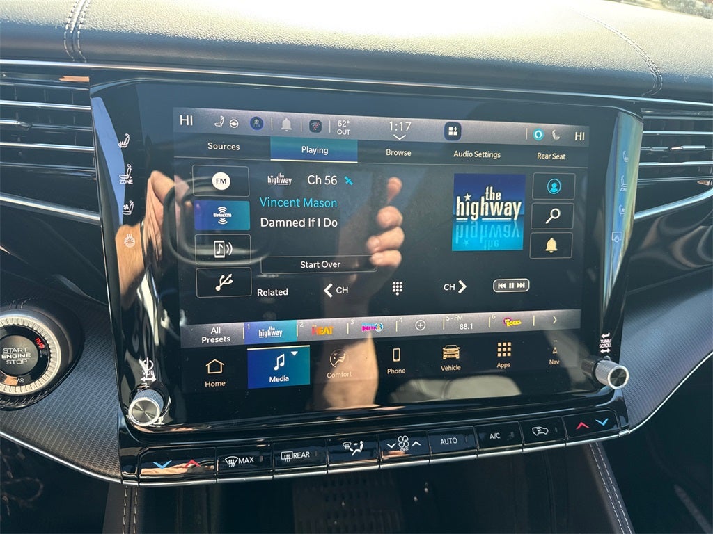 118 MPH Maximum Speed Calibration, 19 Speakers, 3rd row seats: bench, 4-Wheel Disc Brakes, ABS brakes, Adjustable Roof Rail Crossbars, Air Conditioning, Alloy wheels, AM/FM radio: SiriusXM with 360L, Amazon Fire TV Built-in, Anti-whiplash front head restraints, Apple CarPlay/Android Auto, Audio memory, Auto Adjust in Reverse Exterior Mirrors, Auto High-beam Headlights, Auto-dimming door mirrors, Auto-Dimming Exterior Driver Mirror, Auto-dimming Rear-View mirror, Auto-leveling suspension, Automatic temperature control, Black Chiseled Metal Interior Accent, Black Exterior Accents, Blind Spot with Trailer Detection, Brake assist, Bumpers: body-color, Compass, Delay-off headlights, Driver door bin, Driver vanity mirror, Driver's Seat Mounted Armrest, Dual front impact airbags, Dual front side impact airbags, Elec Rear Limited Slip Differential, Electronic Stability Control, Emergency communication system: Jeep Connect, Engine Block Heater, Exterior Mirrors Approach Lamps, Exterior Mirrors with Memory, Exterior Mirrors with Supplemental Signals, Exterior Parking Camera Rear, Four wheel independent suspension, Front anti-roll bar, Front Bucket Seats, Front Center Armrest w/Storage, Front dual zone A/C, Front fog lights, Front Passenger Interactive Display, Front reading lights, Fully automatic headlights, Garage door transmitter, HD Trailer Tow Package, Heads-Up Display, Heated door mirrors, Heated Exterior Mirrors, Heated front seats, Heated rear seats, Heated steering wheel, Illuminated entry, Knee airbag, Leather steering wheel, Leather Trimmed Bucket Seats, Low tire pressure warning, Manufacturer Statement of Origin, Memory seat, Navigation System, Normal Duty Suspension, Obsidian Appearance Package, Occupant sensing airbag, Outside temperature display, Overhead airbag, Overhead console, Panic alarm, Passenger door bin, Passenger seat mounted armrest, Passenger vanity mirror, Power adjustable front head restraints, Power door mirrors, Power driver seat, Power Liftgate, Power moonroof, Power passenger seat, Power steering, Power windows, Premium Group III, Quick Order Package 29Z Obsidian, Radio data system, Radio: Uconnect 5 Nav with 12 Display, Rain sensing wipers, Rear air conditioning, Rear anti-roll bar, Rear dual zone A/C, Rear reading lights, Rear seat center armrest, Rear Seat Video Group I, Rear window defroster, Rear window wiper, Rearview Autodim Digital Display Mirror, Reclining 3rd row seat, Remote keyless entry, Removable Rear Tow Hooks, Reversible Carpet/Vinyl Cargo Mat, Seatback Video Screens, Security system, Selec-Speed Control, Speed control, Speed-sensing steering, Speed-Sensitive Wipers, Split folding rear seat, Steering wheel memory, Steering wheel mounted audio controls, Tachometer, Telescoping steering wheel, Tilt steering wheel, Titanium Daylight Opening Upper, Titanium Upper Grille Applique, Traction control, Trailer Brake Control, Trailer Hitch Zoom, Trailer Light Monitoring, Trip computer, Turn signal indicator mirrors, Vapor Tow Hooks, Variably intermittent wipers, Ventilated front seats, Ventilated Rear Seats, Video USB Port, Voltmeter, Wheels: 22 x 9.0 Aluminum Painted, Wheels: 22 x 9.0 Tinted Polished with Black Insert.