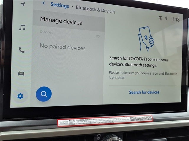 2.4L 4-Cylinder, 18 Alloy Wheels, 3.583 Axle Ratio, 4-Wheel Disc Brakes, 6 Speakers, ABS brakes, Air Conditioning, Alloy wheels, AM/FM radio: SiriusXM, Anti-whiplash front head restraints, Apple CarPlay/Android Auto, ARB Rear Tow Hooks, Auto High-beam Headlights, Auto-dimming Rear-View mirror, Automatic temperature control, Brake assist, Bumpers: body-color, Driver door bin, Driver vanity mirror, Dual front impact airbags, Dual front side impact airbags, Electronic Stability Control, Emergency communication system: Safety Connect (up to 10-year trial subscription), Exterior Parking Camera Rear, Fabric Seat Trim, Four wheel independent suspension, Front anti-roll bar, Front Bucket Seats, Front Center Armrest, Front fog lights, Front reading lights, Fully automatic headlights, Heated door mirrors, Illuminated entry, JBL Premium Audio, Knee airbag, Leather Shift Knob, Leather steering wheel, Low tire pressure warning, Navigation system: Drive Connect Cloud Navigation (1-year trial subscription), Occupant sensing airbag, on-Off Front Stabilizer Disconnect Mechanism, Outside temperature display, Overhead airbag, Overhead console, Panic alarm, Passenger door bin, Passenger vanity mirror, Power door mirrors, Power steering, Power windows, Radio: 14 Toyota Audio Multimedia, Radio: 8 Toyota Audio Multimedia, Radio: Premium Audio with 14 Display, Rear step bumper, Rear window defroster, Remote keyless entry, Removable Predator Step, Security system, SofTex Seat Trim, Speed control, Speed-sensing steering, Split folding rear seat, Spray-on Bed Liner, Steering wheel mounted audio controls, Tachometer, Telescoping steering wheel, Tilt steering wheel, Traction control, TRD Off Road Package, Trip computer, Turn signal indicator mirrors, Variably intermittent wipers, 2.4L 4-Cylinder.