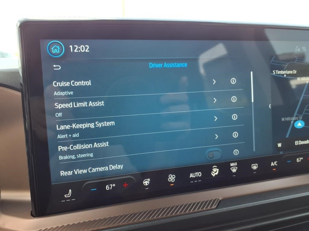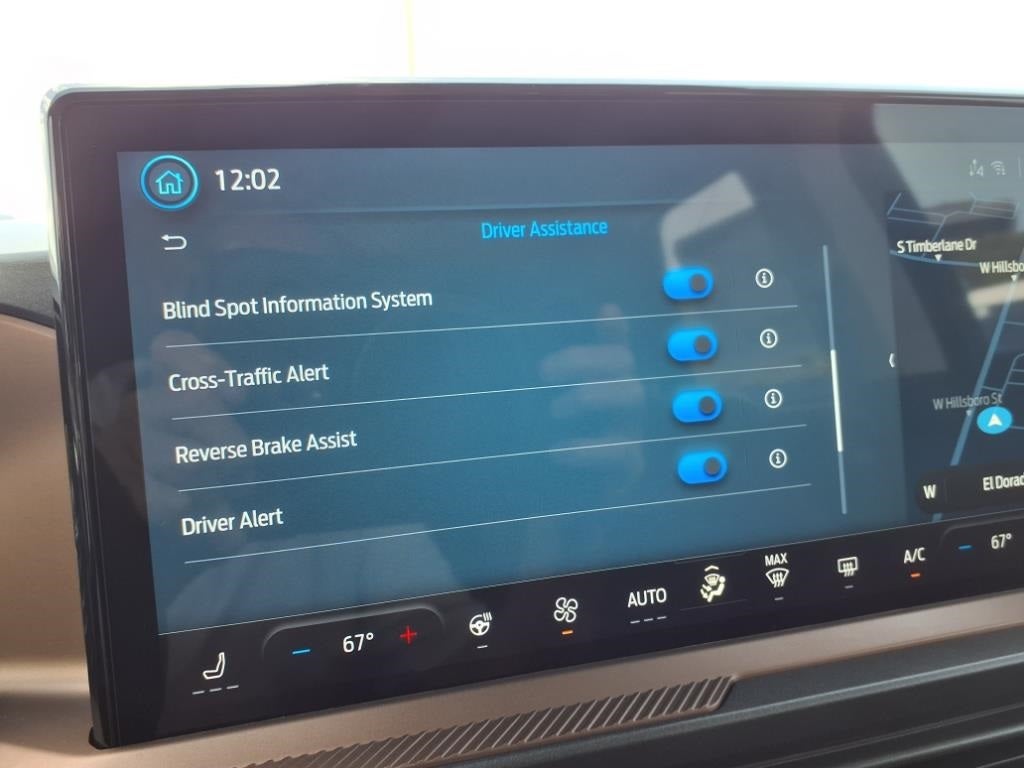 4-Wheel Disc Brakes, 6 Speakers, ABS brakes, Air Conditioning, Alloy wheels, AM/FM radio: SiriusXM, AM/FM Stereo, Auto High-beam Headlights, Auto-dimming Rear-View mirror, Automatic temperature control, Brake assist, Compass, Delay-off headlights, Driver door bin, Driver vanity mirror, Dual front impact airbags, Dual front side impact airbags, Electronic Stability Control, Emergency communication system: SYNC 4 911 Assist, Four wheel independent suspension, Front anti-roll bar, Front Bucket Seats, Front Center Armrest, Front Driver/Passenger Seat Back Map Pockets, Front dual zone A/C, Front fog lights, Front reading lights, Fully automatic headlights, Garage door transmitter, Heated door mirrors, Heated front seats, Heated steering wheel, Illuminated entry, Knee airbag, Low tire pressure warning, Memory seat, Occupant sensing airbag, Outside temperature display, Overhead airbag, Overhead console, Panic alarm, Passenger door bin, Passenger vanity mirror, Power door mirrors, Power driver seat, Power passenger seat, Power steering, Power windows, Premium Trimmed Front Bucket Seats w/Ebony/Roast, Radio data system, Rain sensing wipers, Rear anti-roll bar, Rear Parking Sensors, Rear reading lights, Rear seat center armrest, Rear window defroster, Rear window wiper, Remote keyless entry, Security system, SiriusXM, Speed control, Speed-sensing steering, Speed-Sensitive Wipers, Split folding rear seat, Steering wheel mounted audio controls, SYNC 4 w/Enhanced Voice Recognition, Tachometer, Telescoping steering wheel, Tilt steering wheel, Traction control, Trip computer, Variably intermittent wipers, Wheels: 18 Ebony Black-Painted Aluminum.