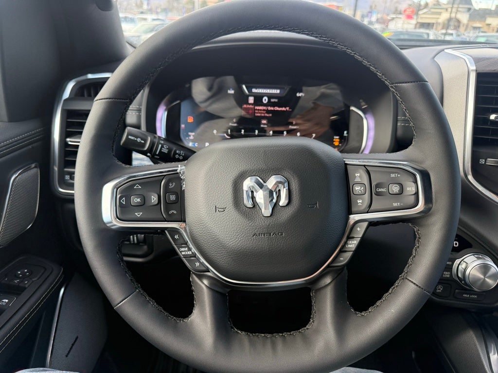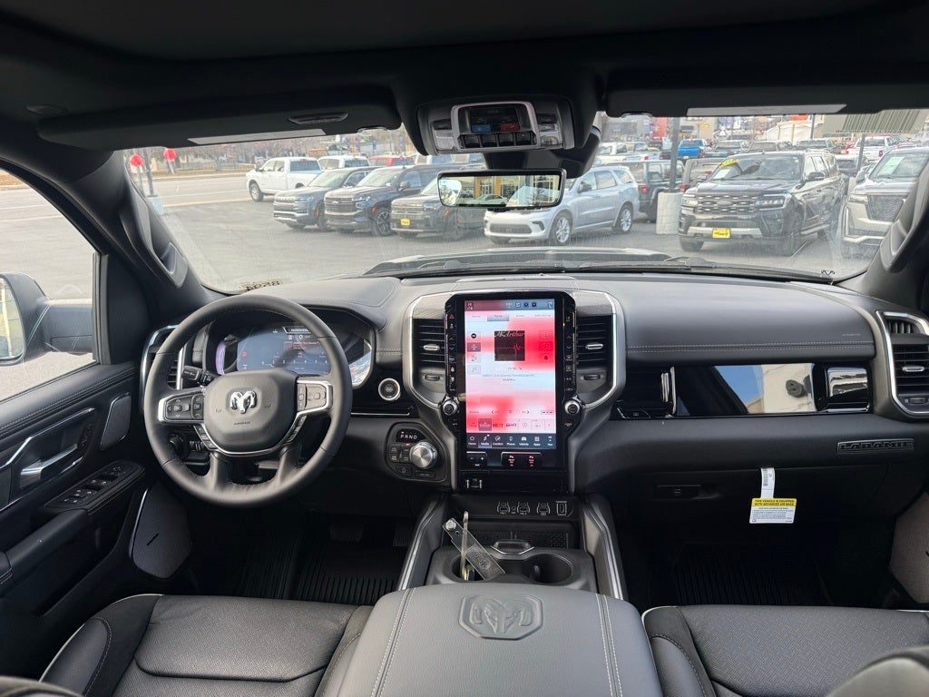 10 Speakers, 12-Way/1-Way Trailer Connector, 14.4 Touchscreen Display, 4-Wheel Disc Brakes, 4G LTE Wi-Fi Hot Spot, ABS brakes, Accent Color Door Handles, Accent Color Premium Power Mirrors, Accent Color Tailgate Handle, Active Driving Assist System, Active Noise Control System, Adjustable pedals, Advanced Safety Group II, Air Conditioning, Alloy wheels, AM/FM radio: SiriusXM with 360L, Anti-Spin Differential Rear Axle, Apple CarPlay/Android Auto, Audio memory, Auto High-beam Headlights, Auto Power-Folding Mirrors, Auto-dimming door mirrors, Auto-Dimming Exterior Driver Mirror, Auto-dimming Rear-View mirror, Automatic temperature control, Bed Utility Group, Black Exterior Truck Badging, Black Headlamp Bezels, Black Interior Accents, Black Painted Exterior Mirrors Caps, Black Tail Lamp Bezels, Body Color Front Bumper, Body Color Rear Bumper with Step Pads, Brake assist, Bumpers: chrome, Chrome Exterior Mirrors, Cluster 12 TFT Color Display, Compass, Connected Travel and Traffic Services, Connectivity - US/Canada, Convex Wide-Angle Exterior Mirror Insert, Delay-off headlights, Dome Dual LED Reading Lamp, Driver door bin, Driver vanity mirror, Drowsy Driver Detection, Dual Exhaust with Black Tips, Dual front impact airbags, Dual front side impact airbags, Dual-Pane Panoramic Sunroof, E-Locker Rear Axle, Electronic Stability Control, Evasive Steer Assist, Exterior 115V AC Outlet, Exterior Mirrors Approach Lamps, Exterior Mirrors Courtesy Lamps, Exterior Mirrors with Heating Element, Exterior Mirrors with Memory, Exterior Mirrors with Supplemental Signals, Front anti-roll bar, Front Bucket Seats, Front Center Armrest w/Storage, Front dual zone A/C, Front fog lights, Front License Plate Bracket, Front Passenger Interactive Display, Front reading lights, Front wheel independent suspension, Fully automatic headlights, Garage door transmitter, GPS Navigation, Grille Surround 3 Black Texture 2 Black, Harman/Kardon 19 Speaker Premium Sound, Heads-Up Display, Heated door mirrors, Heated front seats, Heated rear seats, Heated steering wheel, Illuminated entry, Integrated Center Stack Radio, Integrated Voice Command with Bluetooth®, Intersection Collision Assist System, Laramie Level 2 Equipment Group, Leather steering wheel, Leather Trimmed Bucket Seats, LED CHMSL Lamp, LED Dome/Reading Lamp, Low tire pressure warning, Manufacturer's Statement of Origin, Memory seat, MOPAR 4 Adjustable Cargo Tie-Down Hooks, MOPAR Front and Rear Rubber Floor Mats, MOPAR Spray in Bedliner, Navigation System, Night Edition, Occupant sensing airbag, Off-Road Information Pages, Outside temperature display, Overhead airbag, Overhead console, Panic alarm, ParkView Rear Back-Up Camera, Passenger door bin, Passenger vanity mirror, Pedal memory, Pirelli Brand Tires, Power Deployable Running Boards, Power door mirrors, Power driver seat, Power passenger seat, Power steering, Power Tailgate, Power windows, Protection Group, Proximity Approach/Departure Lamps, Quick Order Package 27H Laramie, Radio data system, Radio: Uconnect 5 Nav with 14.4 Display, Radio: Uconnect 5 Navigation with 12.0 Display, Rain Sensitive Windshield Wipers, RAM Grille Badge - Black, RAM Grille Badge - Chrome, Rear anti-roll bar, Rear reading lights, Rear seat center armrest, Rear step bumper, Remote keyless entry, Security system, SiriusXM Radio Service, SiriusXM with 360L, Speed control, Split folding rear seat, Sport Performance Hood, Steering wheel mounted audio controls, Surround View Camera System, Tachometer, Technology Group, Telescoping steering wheel, Tilt steering wheel, Tow Hooks, Traction control, Traffic Sign Recognition, Trailer Brake Control, Trip computer, Turn signal indicator mirrors, USB Host Flip, Variably intermittent wipers Price includes: $1000 - 2026 National Bonus Cash . Exp. 03/31/2026 $3500 - 2026 National Retail Bonus Cash . Exp. 03/31/2