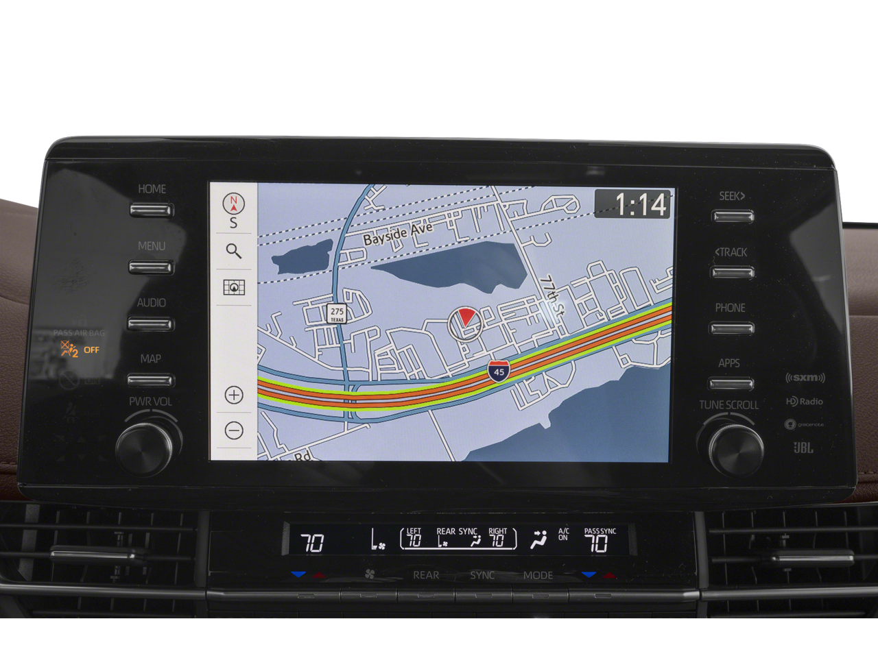 AWD, 12 Speakers, 1500 Watt Inverter Output, 3rd row seats: split-bench, 4-Wheel Disc Brakes, ABS brakes, Air Conditioning, All Weather Floor Mats with VC, Alloy wheels, AM/FM radio: SiriusXM, Apple CarPlay/Android Auto, Auto High-beam Headlights, Auto-dimming door mirrors, Auto-dimming Rear-View mirror, Automatic temperature control, Body Side Molding, Brake assist, Bumpers: body-color, Compass, Cross Bars, Delay-off headlights, Driver door bin, Driver vanity mirror, Driver's Seat Mounted Armrest, Dual front impact airbags, Dual front side impact airbags, Electronic Stability Control, Emergency communication system: Safety Connect (3-year trial), Exterior Parking Camera Rear, Four wheel independent suspension, Front anti-roll bar, Front Bucket Seats, Front dual zone A/C, Front fog lights, Front Heated and Ventilated Bucket Seats, Front reading lights, Fully automatic headlights, Garage door transmitter: HomeLink, Heads-Up Display, Heated door mirrors, Heated front seats, Heated rear seats, Heated steering wheel, Illuminated Door Sills, Illuminated entry, Intelligent Inside Rear View Mirror, Knee airbag, Lane Departure Warning System, Leather Seat Trim, Leather Shift Knob, Leather steering wheel, Low tire pressure warning, Memory seat, Mudguards, Navigation System, Occupant sensing airbag, Outside temperature display, Overhead airbag, Overhead console, Panic alarm, Passenger door bin, Passenger seat mounted armrest, Passenger vanity mirror, Platinum Package, Power door mirrors, Power driver seat, Power Liftgate, Power moonroof, Power passenger seat, Power steering, Power windows, Premium Paint, Radio data system, Radio: Toyota JBL Audio Multimedia System, Rain sensing wipers, Rear air conditioning, Rear anti-roll bar, Rear Bumper Applique, Rear dual zone A/C, Rear reading lights, Rear side impact airbag, Rear window defroster, Rear window wiper, Rear-Seat Entertainment, Reclining 3rd row seat, Remote keyless entry, SiriusXM Trial Offering: 33 Months, Speed control, Speed-sensing steering, Split folding rear seat, Spoiler, Steering wheel memory, Steering wheel mounted audio controls, Tachometer, TBD Axle Ratio, Telescoping steering wheel, Tilt steering wheel, Traction control, Trip computer, Turn signal indicator mirrors, Vacuum and Cooler, Variably intermittent wipers, Ventilated front seats, Wheels: 18 Two-Tone Alloy, AWD.