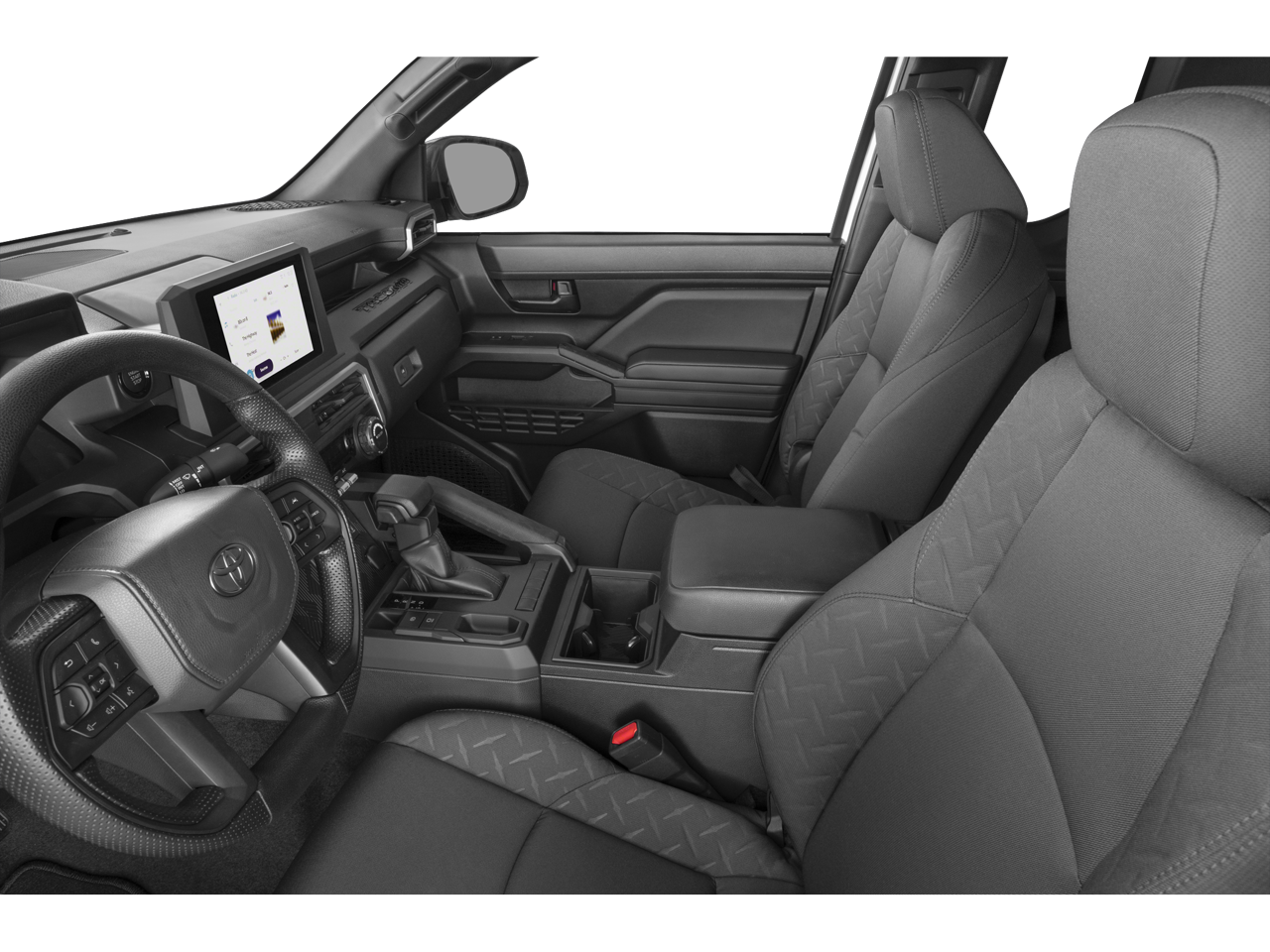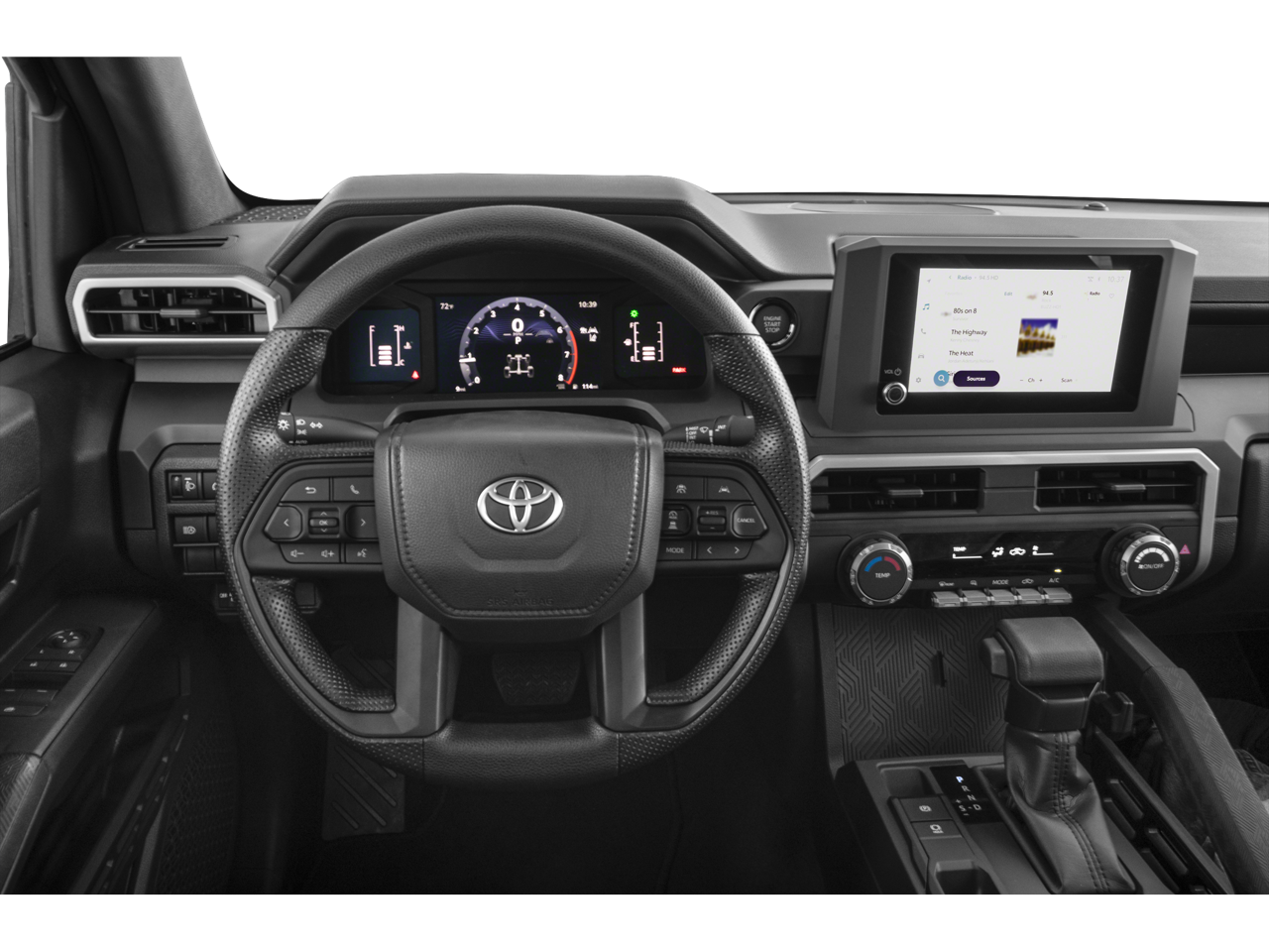 4WD, 17 Steel Wheels, 3.583 Axle Ratio, 4 Speakers, 4-Wheel Disc Brakes, ABS brakes, Air Conditioning, All Weather Floor Liners, AM/FM radio: SiriusXM, Anti-whiplash front head restraints, Apple CarPlay/Android Auto, Auto High-beam Headlights, Black Badge Overlay, Black Chrome Exhaust Tip, Black Tailgate Insert, Blind Spot Monitor, Brake assist, Bumpers: body-color, Driver door bin, Dual front impact airbags, Dual front side impact airbags, Electronic Stability Control, Emergency communication system: Safety Connect (up to 10-year trial subscription), Exterior Parking Camera Rear, Fabric Seat Trim, Front anti-roll bar, Front Bucket Seats, Front Center Armrest, Front reading lights, Front wheel independent suspension, Fully automatic headlights, Heated door mirrors, Illuminated entry, Knee airbag, Low tire pressure warning, Occupant sensing airbag, Outside temperature display, Overhead airbag, Overhead console, Passenger door bin, Power door mirrors, Power steering, Power windows, Radio: 8 Toyota Audio Multimedia, Rear step bumper, Rear window defroster, Remote keyless entry, Smart Key w/Digital Key Technology, Speed control, Speed-sensing steering, SR Upgrade Package, Steering wheel mounted audio controls, Tachometer, Telescoping steering wheel, Tilt steering wheel, Traction control, Trip computer, Variably intermittent wipers, 4WD.