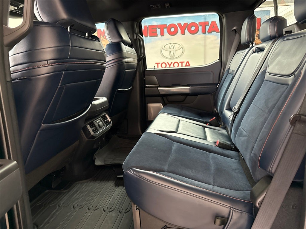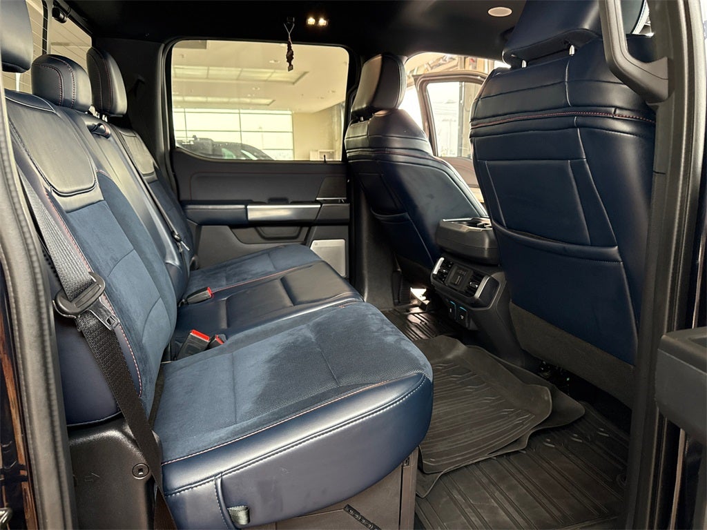 4WD, 17 Cast Aluminum Wheels, 360 Degree Camera, 4-Wheel Disc Brakes, 7 Speakers, ABS brakes, Adaptive suspension, Adjustable pedals, Air Conditioning, Alloy wheels, AM/FM radio: SiriusXM with 360L, Auto High-beam Headlights, Auto-dimming door mirrors, Auto-dimming Rear-View mirror, Automatic temperature control, BlueCruise Prep Kit, Brake assist, Bumpers: body-color, Compass, Connected Built-In Navigation, Convenience Package, Delay-off headlights, Driver door bin, Driver vanity mirror, Dual front impact airbags, Dual front side impact airbags, Electronic Locking w/4.10 Axle Ratio, Electronic Stability Control, Emergency communication system: SYNC 4 911 Assist, Equipment Group 801A High, Exterior Parking Camera Rear, Forward Sensing System, Front anti-roll bar, Front Bucket Seats, Front Center Armrest, Front dual zone A/C, Front reading lights, Front wheel independent suspension, Front-Axle w/Torsen Differential, Fully automatic headlights, GVWR: 7,050 lbs Payload Package, Heated door mirrors, Heated front seats, Heated Steering Wheel, Illuminated entry, Integrated Trailer Brake Controller, Interior Work Surface, Leather Trim Seats, Leather Trim Seats w/Heated 2nd Row, LED Projector w/Dynamic Bending Headlamps, Low tire pressure warning, Memory seat, Navigation system: Connected Navigation (90-Day Trial), Occupant sensing airbag, Outside temperature display, Overhead airbag, Overhead console, Panic alarm, Partitioned Lockable Fold-Flat Storage, Passenger door bin, Passenger vanity mirror, Pedal memory, Power door mirrors, Power driver seat, Power passenger seat, Power steering, Power Tailgate, Power Tech Package, Power Tilt/Telescoping Steering Column w/Memory, Power windows, Pro Power Onboard - 2KW, Pro Trailer Backup Assist, Radio data system, Radio: AM/FM SiriusXM w/360L, Radio: B&O Unleashed Sound System by Bang & Olufsen, Rain-Sensing Wipers, Raptor 37 Graphics, Raptor 37 Performance Package, Rear reading lights, Rear step bumper, Rear window defroster, Recaro Unique Blue Accent 40/Console/40 Front Seats, Remote keyless entry, Rigid LED Fog Lamp, Security system, Speed control, Speed-sensing steering, Split folding rear seat, Sport Tuned Shock Absorbers, Steering wheel mounted audio controls, SYNC 4 w/Enhanced Voice Recognition, Tachometer, Tailgate Applique FORD, Telescoping steering wheel, Tilt steering wheel, Torsen Package, Tough Bed Spray-In Bedliner, Tow Technology Package, Traction control, Trip computer, Turn signal indicator mirrors, Unique Blue Leather Console w/Raptor Logo, Universal Garage Door Opener, Variably intermittent wipers, Ventilated front seats, Wheels: Unique 17 Forged Aluminum Bead-Lock Capable, Wireless Charging Pad, 4WD.