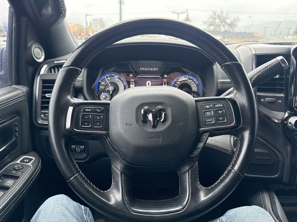 10 Speakers, 12 Touchscreen Display, 17 Speaker harman kardon Premium Sound, 220 Amp Alternator, 3.73 Axle Ratio, 4-Wheel Disc Brakes, 4G LTE Wi-Fi Hot Spot, 5th Wheel/Gooseneck Towing Prep Group, ABS brakes, Active Noise Control System, Adaptive Cruise Control w/Stop, Adaptive Steering System, Adjustable pedals, Air Conditioning, Air Suspension Decal, Alloy wheels, AM/FM radio: SiriusXM with 360L, Anti-Spin Differential Rear Axle, Apple CarPlay, Apple CarPlay/Android Auto, Audio memory, Auto High-beam Headlights, Auto Level Rear Air Suspension, Auto-dimming Rear-View mirror, Automatic temperature control, Black Exterior Mirrors, Black Exterior Truck Badging, Black Grille Limited, Black Headlamp Bezels, Black Ram Head Tailgate Badge, Black Tail Lamp Bezels, Black Wheel Center Hub, Body Color Door Handles, Body Color Grille Surround, Bodyside moldings, Brake assist, Bumpers: chrome, Cold Weather Group, Compass, Connected Travel & Traffic Services, Connectivity - US/Canada, CTR Stop Lamp w/Cargo View Camera, Dash Pass Thru Wire Circuits, Delay-off headlights, Digital Rearview Mirror, Disassociated Touchscreen Display, Driver door bin, Driver vanity mirror, Dual front impact airbags, Dual front side impact airbags, Electronic Stability Control, Electronically Controlled Throttle, Engine Block Heater, Exterior Mirrors Courtesy Lamps, Exterior Mirrors w/Heating Element, Exterior Mirrors w/Memory, Exterior Mirrors w/Supplemental Signals, Front anti-roll bar, Front Bucket Seats, Front Center Armrest w/Storage, Front dual zone A/C, Front fog lights, Front License Plate Bracket, Front reading lights, Full Speed Forward Collision Warning Plus, Fully automatic headlights, Garage door transmitter, Genuine wood console insert, Genuine wood dashboard insert, Genuine wood door panel insert, Global Telematics Box Module (TBM), Google Android Auto, GPS Antenna Input, GPS Navigation, HD Radio, Heated door mirrors, Heated front seats, Heated rear seats, Heated steering wheel, Heavy Duty Snow Plow Prep Group, I/P Mounted Auxiliary Switches, Illuminated entry, Integrated Voice Command w/Bluetooth®, Lane Keep Assist, Leather steering wheel, Limited Leather Bucket Seats, Limited Level 1 Equipment Group, Low tire pressure warning, Manufacturer's Statement of Origin, Memory seat, Mirror Running Lights, Mirror-Mounted Aux Reverse Lamps, MOPAR Winter Front Grille Cover, Navigation System, Night Edition, Occupant sensing airbag, Off-Road Information Pages, Outside temperature display, Overhead airbag, Overhead console, Painted Front Bumper, Painted Rear Bumper, Panic alarm, ParkView Rear Back-Up Camera, Passenger door bin, Passenger vanity mirror, Pedal memory, Pickup Box, Power Adjustable Convex Aux Mirrors, Power Black Tow Mirrors w/Convex Spotter & Memory, Power door mirrors, Power driver seat, Power Folding Mirrors, Power passenger seat, Power steering, Power Sunroof, Power windows, Protection Group, Quick Order Package 2HM Limited, Radio data system, Radio: Uconnect 5 Nav w/12.0 Display, Rain sensing wipers, RamBox Delete, Rear anti-roll bar, Rear reading lights, Rear seat center armrest, Rear step bumper, Rear window defroster, Remote keyless entry, Security system, Selectable Tire Fill Alert, SiriusXM w/360L, Speed control, Split folding rear seat, Steering wheel mounted audio controls, Surround View Camera System, Tachometer, Tilt steering wheel, Tip Start, Tow Hooks, Traction control, Trailer Reverse Guidance, Trailer Tow Mirrors, Trip computer, Turn signal indicator mirrors, Variably intermittent wipers, Vendor Painted Cargo Box, Vendor Painted Cargo Box Tracking, Ventilated front seats, Voltmeter, Wheels: 20 x 8.0 Cast Aluminum Black, Wheels: 20 x 8.0 Satin Carbon w/Chrome Inserts.