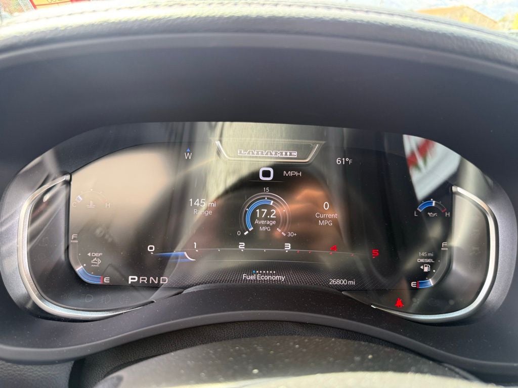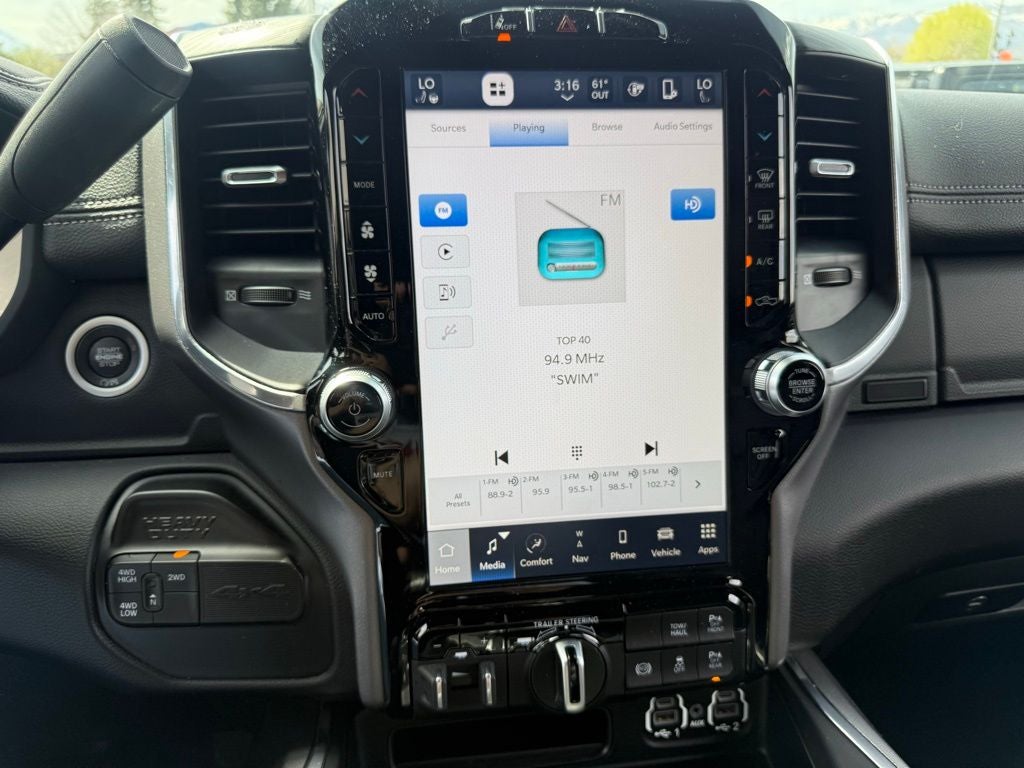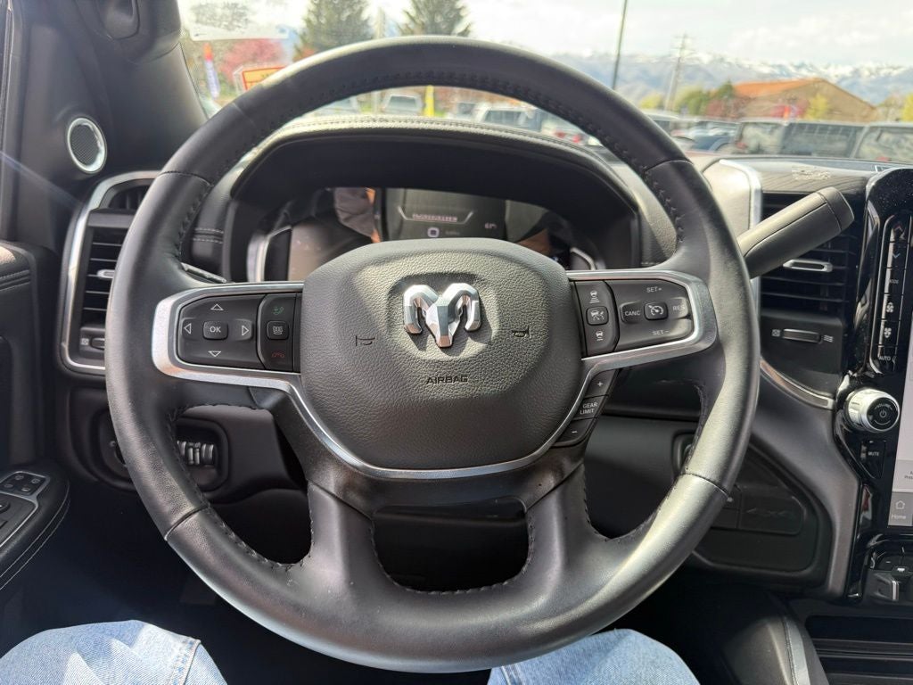 10 Speakers, 115V Auxiliary Rear Power Outlet, 12 Touchscreen Display, 17 Speaker harman/kardon Premium Sound, 2 Way Rear Headrest Seat, 220 Amp Alternator, 2nd Row In Floor Storage Bins, 3.73 Axle Ratio, 4 Way Front Headrests, 4-Wheel Disc Brakes, 4G LTE Wi-Fi Hot Spot, 5th Wheel/Gooseneck Towing Prep Group, ABS brakes, Active Noise Control System, Adaptive Cruise Control w/Stop, Adaptive Steering System, Air Conditioning, Alexa Built-In, Alloy wheels, AM/FM radio: SiriusXM with 360L, Apple CarPlay, Apple CarPlay/Android Auto, Auto Adjust In Reverse Exterior Mirrors, Auto Dim Exterior Mirror, Auto High Beam Headlamp Control, Auto Power-Folding Mirrors, Auto-Dimming Exterior Passenger Mirror, Automatic temperature control, Bed Utility Group, Black Exterior Truck Badging, Black Headlamp Bezels, Black Interior Accents, Black Ram Head Tailgate Badge, Black Tail Lamp Bezels, Black Wheel Center Hub, Blind Spot & Cross Path Detection, Body Color Grille Surround, Brake assist, Bumpers: body-color, Center Hub, Chrome Exterior Mirrors, Cluster 12 TFT Color Display, Cold Weather Group, Compass, Connected Travel & Traffic Services, Connectivity - US/Canada, CTR Stop Lamp w/Cargo View Camera, Delay-off headlights, Digital 3.0 Rear View Auto Dimming Mirror, Disassociated Touchscreen Display, Driver door bin, Driver vanity mirror, Dual Alternators Rated At 440 Amps, Dual front impact airbags, Dual front side impact airbags, Electronic Stability Control, Electronically Controlled Throttle, Engine Block Heater, Exterior Mirrors Courtesy Lamps, Exterior Mirrors w/Heating Element, Exterior Mirrors w/Memory, Exterior Mirrors w/Supplemental Signals, Foam Bottle Insert (Door Trim Panel), For Details, Visit DriveUconnect.com, For More Info, Call 800-643-2112, Forward & Reverse Utility Lights, Front anti-roll bar, Front Center Armrest w/Storage, Front dual zone A/C, Front LED Fog Lamps, Front License Plate Bracket, Front reading lights, Front Seat Back Map Pockets, Full Speed Forward Collision Warning Plus, Fully automatic headlights, Garage door transmitter, Global Telematics Box Module (TBM), Gloss Black Grille Billets/Accents, Google Android Auto, GPS Antenna Input, GPS Navigation, HD Radio, Heated door mirrors, Heated Front Seats, Heated front seats, Heated Second Row Seats, Heated Steering Wheel, Heated steering wheel, Illuminated entry, Integrated Voice Command w/Bluetooth®, Lane Keep Assist, Laramie Level B Equipment Group, Leather steering wheel, Leather Trim 40/20/40 Bench Seat, LED Bed Lighting, LED Reflector Headlamps, LED Tail Lamps, Low tire pressure warning, Manufacturer's Statement of Origin, Mirror Running Lights, MOPAR Deployable Bed Step, MOPAR Front & Rear Rubber Floor Mats, MOPAR Spray In Bedliner, MOPAR Winter Front Grille Cover, Navigation System, Night Edition, Occupant sensing airbag, Off-Road Information Pages, Outside temperature display, Overhead airbag, Overhead console, Panic alarm, ParkSense Front/Rear Park Assist System, ParkView Rear Back-Up Camera, Passenger door bin, Passenger vanity mirror, Power 2-Way Driver Lumbar Adjust, Power 2-Way Passenger Lumbar Adjust, Power Adjust 8-Way Driver Seat, Power Adjust 8-Way Front Passenger Seat, Power Adjust Mirrors, Power Adjustable Convex Aux Mirrors, Power Adjustable Pedals w/Memory, Power door mirrors, Power driver seat, Power Heated Fold Telescopic Mirrors w/Memory, Power passenger seat, Power steering, Power Telescoping Mirrors, Power windows, Quick Order Package 2HH Laramie, Radio data system, Radio: Uconnect 5 Nav w/12.0 Display, Rain Sensitive Windshield Wipers, Rear 60/40 Folding Seat, Rear anti-roll bar, Rear Backup Alarm, Rear Power Sliding Window, Rear reading lights, Rear seat center armrest, Rear step bumper, Rear Window Defroster, Rear window defroster, Remote keyless entry, Remote Tailgate Release, Safety Group, Secu