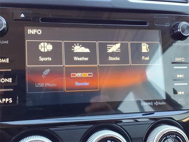4-Wheel Disc Brakes, 6 Speakers, ABS brakes, Air Conditioning, Alloy wheels, AM/FM radio: SiriusXM, Automatic temperature control, Brake assist, Bumpers: body-color, CD player, Driver door bin, Driver vanity mirror, Dual front impact airbags, Dual front side impact airbags, Electronic Stability Control, Emergency communication system: STARLINK, Exterior Parking Camera Rear, Four wheel independent suspension, Front anti-roll bar, Front Bucket Seats, Front Center Armrest, Front reading lights, Illuminated entry, Knee airbag, Low tire pressure warning, Occupant sensing airbag, Outside temperature display, Overhead airbag, Overhead console, Panic alarm, Passenger door bin, Passenger vanity mirror, Power door mirrors, Power driver seat, Power moonroof, Power steering, Power windows, Radio data system, Radio: Subaru Starlink 7.0 Multimedia Plus System, Rear anti-roll bar, Rear seat center armrest, Rear window defroster, Rear window wiper, Remote keyless entry, Roof rack: rails only, Security system, Speed control, Split folding rear seat, Spoiler, Steering wheel mounted audio controls, Tachometer, Telescoping steering wheel, Tilt steering wheel, Traction control, Trip computer, Variably intermittent wipers.