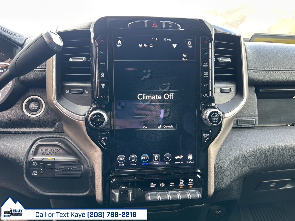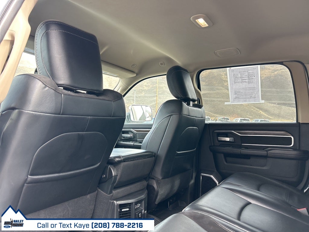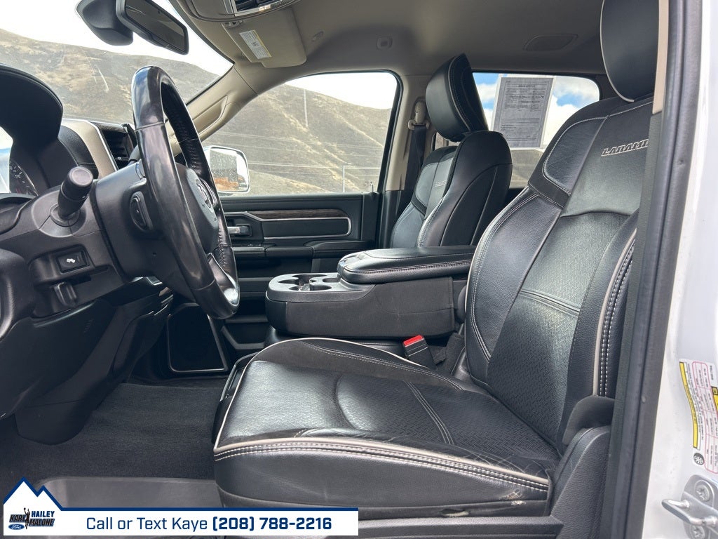 #1 Seat Foam Cushion, 1-Year SiriusXM Guardian Trial, 10 Speakers, 115V Auxiliary Rear Power Outlet, 12 Touchscreen Display, 2 Way Rear Headrest Seat, 220 Amp Alternator, 3.73 Axle Ratio, 4 Way Front Headrests, 4-Wheel Disc Brakes, 4G LTE Wi-Fi Hot Spot, 5-Year SiriusXM Traffic Service, 5-Year SiriusXM Travel Link Service, 8.4 Touchscreen Display, ABS brakes, Active Noise Control System, Adjustable pedals, Air Conditioning, Air Suspension Decal, Alloy wheels, AM/FM radio: SiriusXM, Apple CarPlay, Apple CarPlay/Android Auto, Auto High Beam Headlamp Control, Auto Level Rear Air Suspension, Auto-dimming Rear-View mirror, Automatic temperature control, Blind Spot & Cross Path Detection (DISC), Body Color Bumper Group, Brake assist, Bumpers: chrome, Center Hub, Cold Weather Group, Compass, CTR Stop Lamp w/Cargo View Camera, Delay-off headlights, Disassociated Touchscreen Display, Driver door bin, Driver vanity mirror, Dual Alternators Rated At 440 Amps, Dual front impact airbags, Dual front side impact airbags, Electronic Stability Control, Electronically Controlled Throttle, Engine Block Heater, Exterior Mirrors w/Memory, Foam Bottle Insert (Door Trim Panel), For Details Visit DriveUconnect.com, Front anti-roll bar, Front Bumper Sight Shields, Front Center Armrest w/Storage, Front dual zone A/C, Front fog lights, Front License Plate Bracket, Front reading lights, Front Seat Back Map Pockets, Fully automatic headlights, Garage door transmitter, Google Android Auto, GPS Antenna Input, GPS Navigation, HD Radio, Heated door mirrors, Heated Front Seats, Heated front seats, Heated Steering Wheel, Heated steering wheel, High Back Seats, Illuminated entry, Integrated Center Stack Radio, Integrated Voice Command w/Bluetooth®, Laramie Level 1 Equipment Group (DISC), Leather steering wheel, Leather Trim 40/20/40 Bench Seat, LED Bed Lighting, Low tire pressure warning, Manufacturer's Statement of Origin, Mirror-Mounted Aux Reverse Lamps, MOPAR Front & Rear Rubber Floor Mats, MOPAR Spray In Bedliner, MOPAR Winter Front Grille Cover, Occupant sensing airbag, Outside temperature display, Overhead airbag, Overhead console, Painted Front Bumper, Painted Rear Bumper, Panic alarm, ParkView Rear Back-Up Camera, Passenger door bin, Passenger vanity mirror, Power 8-Way Adjustable Passenger Seat, Power Adjust 8-Way Driver Seat, Power Adjustable Convex Aux Mirrors, Power Adjustable Pedals w/Memory, Power Chrome Tow Mirrors w/Convex Spotter & Memory, Power door mirrors, Power driver seat, Power passenger seat, Power steering, Power windows, Protection Group, Quick Order Package 21H Laramie, Radio data system, Radio: Uconnect 12.0 w/Navigation, Radio: Uconnect 4 w/8.4 Display, Radio/Driver Seat/Mirrors/Pedals Memory, Rain Sensitive Windshield Wipers, RamBox Cargo Management System, Rear 60/40 Folding Seat, Rear reading lights, Rear seat center armrest, Rear step bumper, Rear Wheelhouse Liners, Rear window defroster, Remote keyless entry, Remote Tailgate Release, Security system, Selectable Tire Fill Alert, SiriusXM Satellite Radio, SiriusXM Traffic Plus, SiriusXM Travel Link, SiriusXM w/360L, Speed control, Split folding rear seat, Steering wheel mounted audio controls, Surround View Camera System, Tachometer, Tilt steering wheel, Tip Start, Towing Technology Group (DISC), Traction control, Trailer Reverse Guidance, Trip computer, Turn signal indicator mirrors, Variably intermittent wipers, Ventilated Front Seats, Voltmeter, Wheels: 18 x 8.0 Polished Aluminum.
