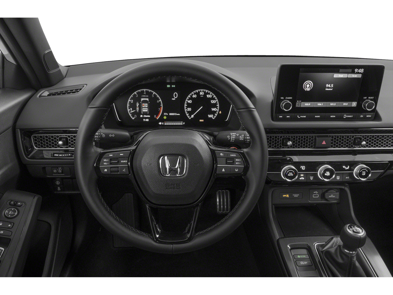 Cloth, 18 Alloy Wheels, 4-Wheel Disc Brakes, 8 Speakers, ABS brakes, Adaptive Cruise Control: Adaptive Cruise Control (ACC) with Low-Speed Follow, Air Conditioning, Alloy wheels, AM/FM radio, Apple CarPlay/Android Auto, Auto High-beam Headlights, Automatic temperature control, Brake assist, Bumpers: body-color, Delay-off headlights, Driver door bin, Driver vanity mirror, Dual front impact airbags, Dual front side impact airbags, Electronic Stability Control, Emergency communication system: HondaLink, Exterior Parking Camera Rear, Fabric Seating Surfaces, Forward collision: Collision Mitigation Braking System (CMBS) + FCW mitigation, Four wheel independent suspension, Front anti-roll bar, Front Bucket Seats, Front Center Armrest, Front reading lights, Fully automatic headlights, Illuminated entry, Knee airbag, Lane departure: Lane Keeping Assist System (LKAS) active, Leather Shift Knob, Leather steering wheel, Low tire pressure warning, Occupant sensing airbag, Outside temperature display, Overhead airbag, Panic alarm, Passenger door bin, Passenger vanity mirror, Power door mirrors, Power steering, Power windows, Radio data system, Radio: 180-Watt Audio System, Rear anti-roll bar, Rear side impact airbag, Rear window defroster, Rear window wiper, Remote keyless entry, Security system, Speed control, Speed-sensing steering, Split folding rear seat, Steering wheel mounted audio controls, Tachometer, Telescoping steering wheel, Tilt steering wheel, Traction control, Trip computer, Voltmeter, Cloth.