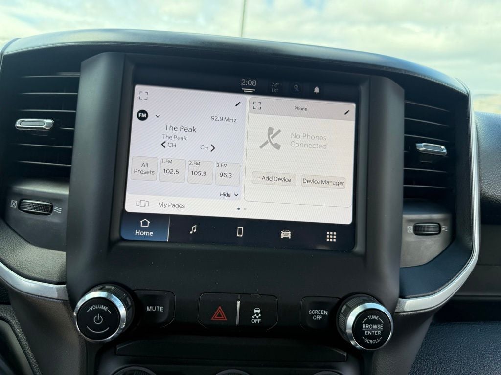 115V Auxiliary Front Power Outlet, 2 Way Rear Headrest Seat, 3.73 Axle Ratio, 4 Way Front Headrests, 4-Wheel Disc Brakes, 40/20/40 Split Bench Seat, 400W Inverter, 4G LTE Wi-Fi Hot Spot, 6 Speakers, 8.4 Touchscreen Display, ABS brakes, Active Noise Control System, Air Conditioning, AM/FM radio: SiriusXM, Apple CarPlay, Apple CarPlay/Android Auto, Bluetooth® Handsfree Phone & Audio, Brake assist, Bumpers: chrome, Center Hub, Center Stack Storage Drawer, Cloth 40/20/40 Bench Seat, Cold Weather Group, Compass, Connectivity - US/Canada, Delay-off headlights, Driver door bin, Dual front impact airbags, Dual front side impact airbags, Electronic Stability Control, Electronically Controlled Throttle, Engine Block Heater, Exterior 115V AC Outlet, Front anti-roll bar, Front Center Armrest w/Storage, Front Fog Lamps, Front License Plate Bracket, Front reading lights, Fully automatic headlights, Global Telematics Box Module (TBM), Google Android Auto, GPS Antenna Input, Heated door mirrors, Illuminated entry, Integrated Center Stack Radio, Integrated Voice Command w/Bluetooth®, Low tire pressure warning, Manual Adjust 4-Way Driver Seat, Manufacturer's Statement of Origin, MOPAR Front & Rear Rubber Floor Mats, MOPAR Winter Front Grille Cover, Occupant sensing airbag, Outside temperature display, Overhead airbag, Overhead console, Panic alarm, ParkView Rear Back-Up Camera, Passenger door bin, Passenger vanity mirror, Power door mirrors, Power steering, Power windows, Protection Group, Quick Order Package 2HZ Big Horn, Radio data system, Radio: Uconnect 5 W w/8.4 Display, Rear anti-roll bar, Rear Folding Seat, Rear seat center armrest, Rear step bumper, Remote keyless entry, Remote Start System, Selectable Tire Fill Alert, SiriusXM Radio Service, SiriusXM Satellite Radio, Speed control, Tachometer, Tilt steering wheel, Tip Start, Tow Hooks, Traction control, Trip computer, Turn signal indicator mirrors, Variably intermittent wipers, Vendor Painted Cargo Box, Vendor Painted Cargo Box Tracking, Voltmeter, Wheels: 18 x 8.0 Steel Chrome Clad.