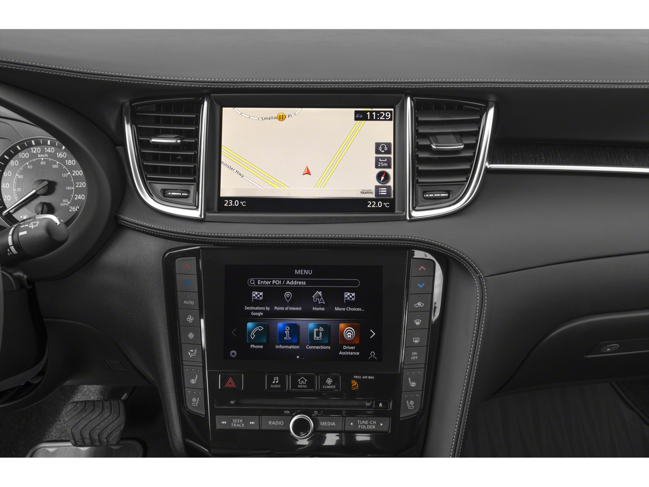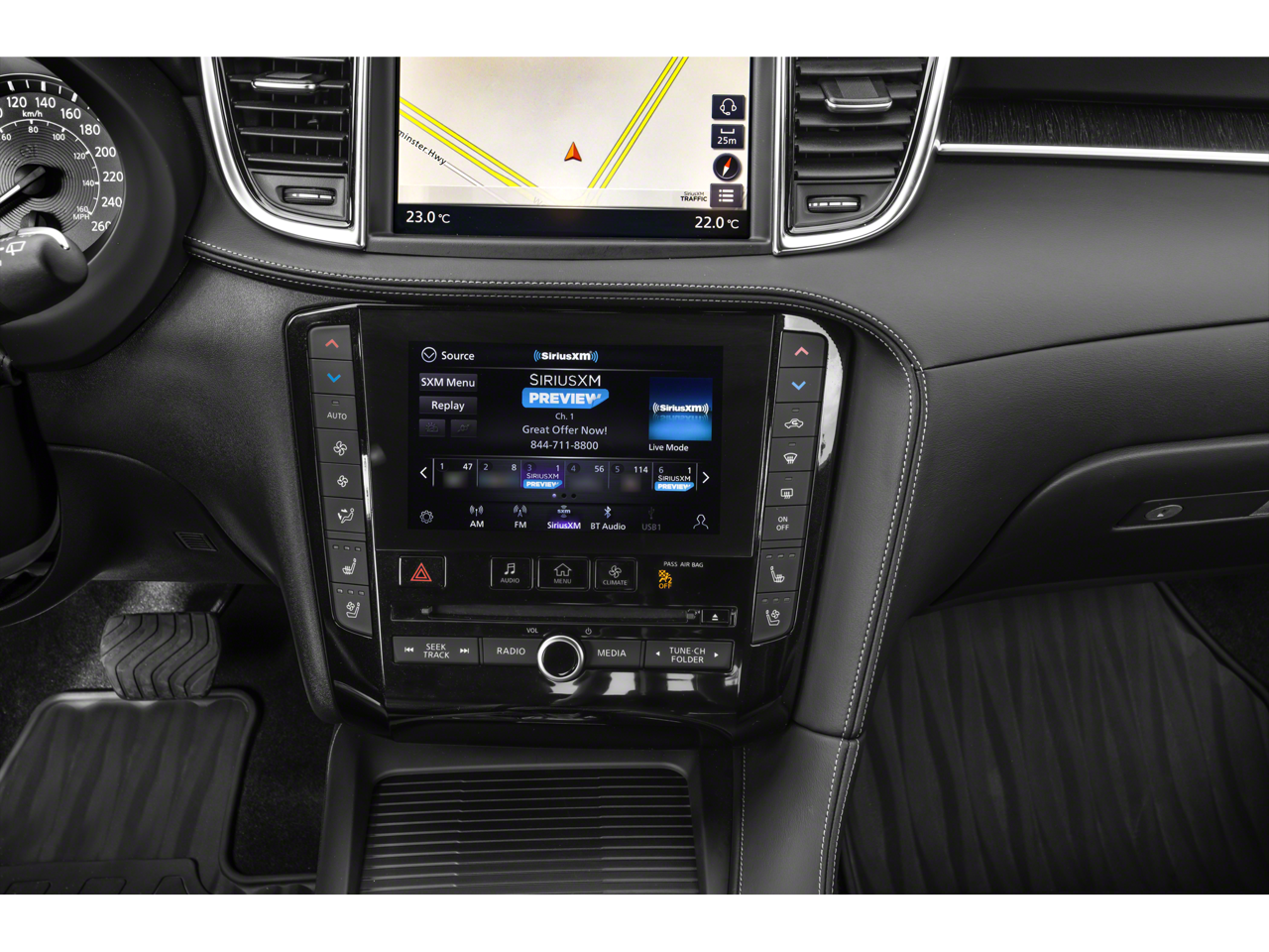 - Radio: Bose Performance Series Premium Audio -inc: 16 speakers, metallic speaker grilles on tweeters, INFINITI InTouch dual display system w/upper 8" and lower 7" HD touch screens, wireless Apple CarPlay and Android Auto, HD Radio technology, SiriusXM radio w/advanced audio features and 90-day complimentary trial, INFINITI voice recognition, INFINITI InTouch services, Siri eyes free, WiFi hotspot, navigation w/3D building graphics including 5-year complimentary access to premium traffic and MapCare, SiriusXM Traffic w/3 month complimentary trial access to real-time traffic information and SiriusXM Travel Link w/3 month complimentary trial access to weather, fuel prices, stock prices, sport scores, movie listings and parking