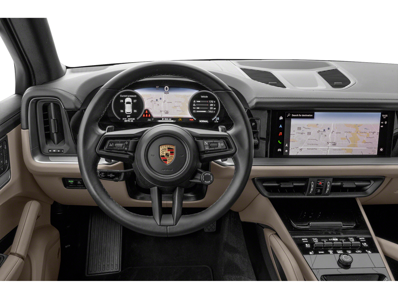 Tan Leather, 10 Speakers, 4-Wheel Disc Brakes, 8-Way Power Seats, ABS brakes, Adaptive suspension, Air Conditioning, Alloy wheels, AM/FM radio: SiriusXM w/360L, Audio memory, Auto High-beam Headlights, Auto-dimming door mirrors, Auto-dimming Rear-View mirror, Automatic temperature control, Axle Ratio: 3.48, Brake assist, Bumpers: body-color, Compass, Delay-off headlights, Driver door bin, Driver vanity mirror, Dual front impact airbags, Dual front side impact airbags, Electronic Stability Control, Exterior Parking Camera Rear, Four wheel independent suspension, Front anti-roll bar, Front Bucket Seats, Front Center Armrest, Front dual zone A/C, Front reading lights, Fully automatic headlights, Garage door transmitter: HomeLink, Heated door mirrors, Heated front seats, HVAC memory, Illuminated entry, Knee airbag, Leather steering wheel, Low tire pressure warning, Memory seat, Navigation System, Occupant sensing airbag, Outside temperature display, Overhead airbag, Overhead console, Panic alarm, Partial Leather Seat Trim, Passenger door bin, Passenger vanity mirror, Porsche Communication Management, Power door mirrors, Power driver seat, Power Liftgate, Power passenger seat, Power steering, Power windows, Radio data system, Rain sensing wipers, Rear anti-roll bar, Rear fog lights, Rear reading lights, Rear seat center armrest, Rear side impact airbag, Rear window defroster, Rear window wiper, Remote keyless entry, Security system, Speed control, Speed-sensing steering, Split folding rear seat, Spoiler, Steering wheel mounted audio controls, Tachometer, Telescoping steering wheel, Tilt steering wheel, Traction control, Trip computer, Turn signal indicator mirrors, Variably intermittent wipers, Voltmeter, Wheels: 20 Cayenne Design, Tan Leather.