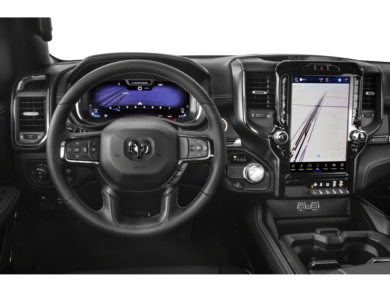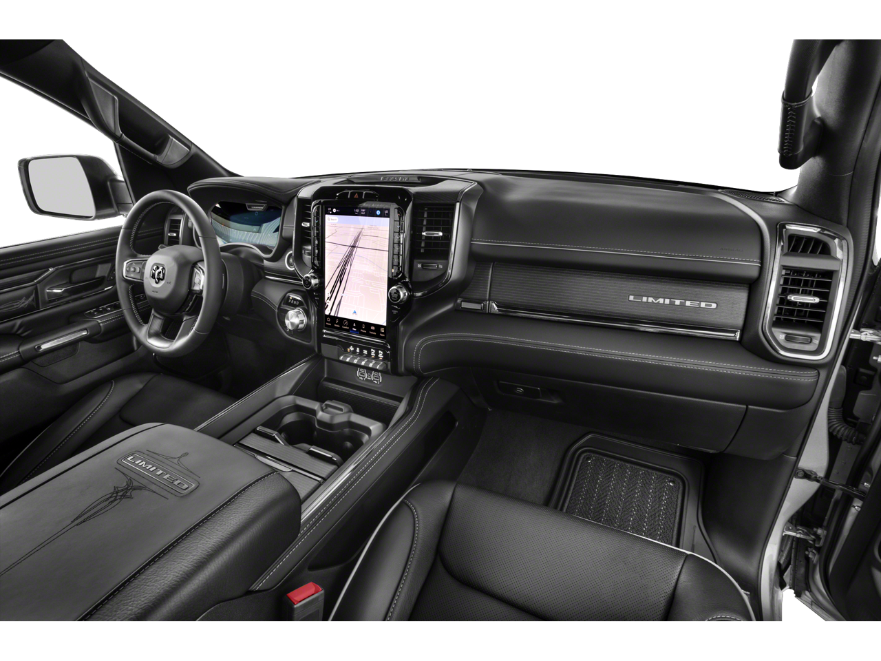 10 Speakers, 4 Way Front Headrests, 4-Wheel Disc Brakes, 48V Belt Starter Generator, ABS brakes, Accent Color Door Handles, Accent Color Premium Power Mirrors, Active Noise Control System, Adaptive Cruise Control w/Stop & Go, Adjustable pedals, Air Conditioning, Alloy wheels, AM/FM radio: SiriusXM with 360L, Apple CarPlay/Android Auto, Audio memory, Auto High-beam Headlights, Auto-dimming door mirrors, Auto-Dimming Exterior Driver Mirror, Auto-dimming Rear-View mirror, Auto-leveling suspension, Automatic temperature control, Black Day Light Opening Moldings, Black Exterior Truck Badging, Black Grille Surround Texture 7 Black, Black Headlamp Bezels, Black Painted Exterior Mirrors Caps, Black Power-Fold Trailer Tow Mirrors, Body Color Front Bumper, Body Color Rear Bumper w/Step Pads, Bodyside moldings, Brake assist, Bucket Seats, Bumpers: chrome, Chrome Exterior Mirrors, Compass, Convex Wide-Angle Exterior Mirror Insert, Delay-off headlights, Digital Rearview Mirror, Dome Dual LED Reading Lamp, Driver door bin, Driver Seat Memory, Driver vanity mirror, Dual Exhaust w/Black Tips, Dual front impact airbags, Dual front side impact airbags, Dual Rear Exhaust w/Bright Tips, Dual-Pane Panoramic Sunroof, Electronic Stability Control, Exterior Mirrors Courtesy Lamps, Exterior Mirrors w/Heating Element, Exterior Mirrors w/Memory, Exterior Mirrors w/Supplemental Signals, Front anti-roll bar, Front Bucket Seats, Front Center Armrest w/Storage, Front dual zone A/C, Front fog lights, Front License Plate Bracket, Front reading lights, Front Seat Back Map Pockets, Front wheel independent suspension, Full Length Premium Floor Console, Fully automatic headlights, Garage door transmitter, Genuine wood console insert, Genuine wood dashboard insert, Genuine wood door panel insert, harman/kardon 19 Speaker Premium Sound, Heads-Up Display, Heated door mirrors, Heated Front Seats, Heated front seats, Heated rear seats, Heated Second Row Seats, Heated Steering Wheel, Heated steering wheel, Heavy-Duty Engine Cooling, HEMI Badge, Illuminated entry, Lane Keep Assist, Leather steering wheel, LED CHMSL Lamp, LED Dome/Reading Lamp, Limited Level 1 Equipment Group, Low tire pressure warning, Memory seat, Mirror Clearance/Running Lights, Mirror-Mounted Aux Reverse Lamps, MOPAR Spray In Bedliner, Navigation System, Night Edition, Occupant sensing airbag, Outside temperature display, Overhead airbag, Overhead console, Panic alarm, Parallel & Perp Park Assist w/Stop, ParkSense Front/Rear Park Assist w/Stop, ParkView Rear Back-Up Camera, Passenger door bin, Passenger vanity mirror, Passive Tuned Mass Damper, Pedal memory, Pedestrian Emergency Braking, Pick-Up Box Lighting, Power 4-Way Driver Lumbar Adjust, Power 4-Way Passenger Lumbar Adjust, Power 8-Way Driver & Passenger Seats, Power door mirrors, Power driver seat, Power passenger seat, Power Running Boards, Power steering, Power windows, Power-Folding Mirrors, Premium Leather Trimmed Bucket Seats, Quick Order Package 27M Limited, Radio data system, Radio: Uconnect 5 Nav w/12.0 Display, Rain sensing wipers, RAM Grille Badge - Black, Rear 60/40 Folding Split Recline Seat, Rear anti-roll bar, Rear seat center armrest, Rear step bumper, Rear window defroster, Remote keyless entry, Security system, Speed control, Split folding rear seat, Sport Performance Hood, Steering wheel mounted audio controls, Surround View Camera System, Tachometer, Telescoping steering wheel, Tilt steering wheel, Tow Hooks, Traction control, Trailer Brake Control, Trailer Light Check, Trailer Reverse Steering Control, Trailer Tire Pressure Monitoring System, Trailer Tow Group, Tri-Fold Tonneau Cover, Trip computer, Turn signal indicator mirrors, Variably intermittent wipers, Ventilated Front Seats, Ventilated front seats, Ventilated Rear Seats, Ventilated rear seats, Voltme