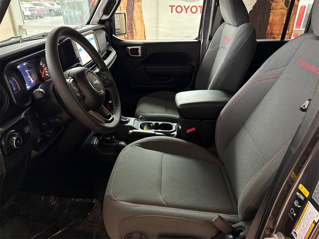 4-Wheel Disc Brakes, 4.10 Rear Axle Ratio, 4G LTE Wi-Fi Hot Spot, 8 Speakers, 97 MPH Vehicle Max Speed Calibration, ABS brakes, Air Conditioning, Alloy wheels, AM/FM radio: SiriusXM, Apple CarPlay, Apple CarPlay/Android Auto, Automatic temperature control, Aux Battery, Auxiliary Switches, Black 3-Piece Hard Top, Brake assist, Class II Receiver Hitch, Cloth Low-Back Bucket Seats, Compass, Connectivity - US/Canada, Delay-off headlights, Driver door bin, Driver vanity mirror, Dual front impact airbags, Dual front side impact airbags, Electronic Stability Control, Emergency communication system: Jeep Connect, Freedom Panel Storage Bag, Front anti-roll bar, Front Bucket Seats, Front Center Armrest w/Storage, Front dual zone A/C, Front fog lights, Front License Plate Bracket (DISC), Front reading lights, Fully automatic headlights, Google Android Auto, Heated door mirrors, Illuminated entry, Integrated roll-over protection, Jeep Trail Rated Kit, Low tire pressure warning, MOPAR All-Weather Floor Mats, MOPAR Hardtop Headliner, Non-Lock Fuel Cap w/o Discriminator, Occupant sensing airbag, Outside temperature display, Overhead airbag, Panic alarm, ParkView Rear Back-Up Camera, Passenger door bin, Passenger vanity mirror, Performance Suspension, Power door mirrors, Power steering, Power windows, Quick Order Package 24R Rubicon, Radio data system, Radio: Uconnect 5 w/12.3 Display, Rear anti-roll bar, Rear reading lights, Rear Window Defroster, Rear Window Wiper/Washer, Remote keyless entry, Security system, Speed control, Split folding rear seat, Steering wheel mounted audio controls, Stop-Start Dual Battery System, Tachometer, Telescoping steering wheel, Tilt steering wheel, Traction control, Trip computer, Variably intermittent wipers, Voltmeter, Wheels: 17 x 7.5 Machined/Painted Black.