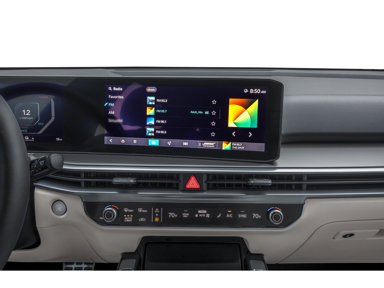 - Radio: AM/FM/SiriusXM Audio System -inc: HD radio, Kia Connect, 12.3 ccNc touchscreen, Bluetooth®, wireless Android Auto, wireless Apple CarPlay, voice recognition, modem, navigation, Bose premium audio w/12 speakers including tweeters and subwoofer, amplifier, over-the-air updates, USB connectivity and Wi-Fi hot spot